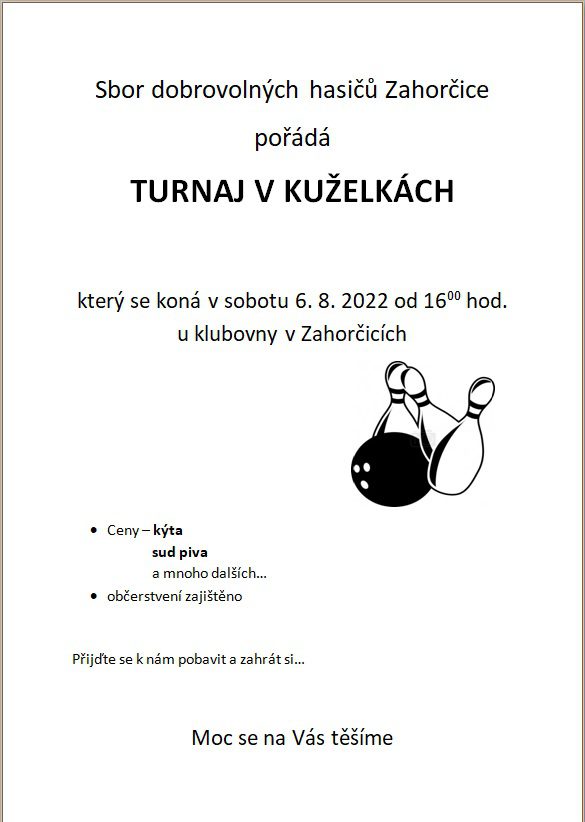 Sbor dobrovolných hasičů Zahorčice pořádá tradiční turnaj v kuželkách, který se uskuteční v sobotu 6. srpna 2022 od 16.00 hod. u klubovny v Zahorčicích. Cena – kýta, sud piva a mnoho dalších. Občerstvení zajištění. Přijďte se k nám pobavit a zahrát si! Plakát je zde.